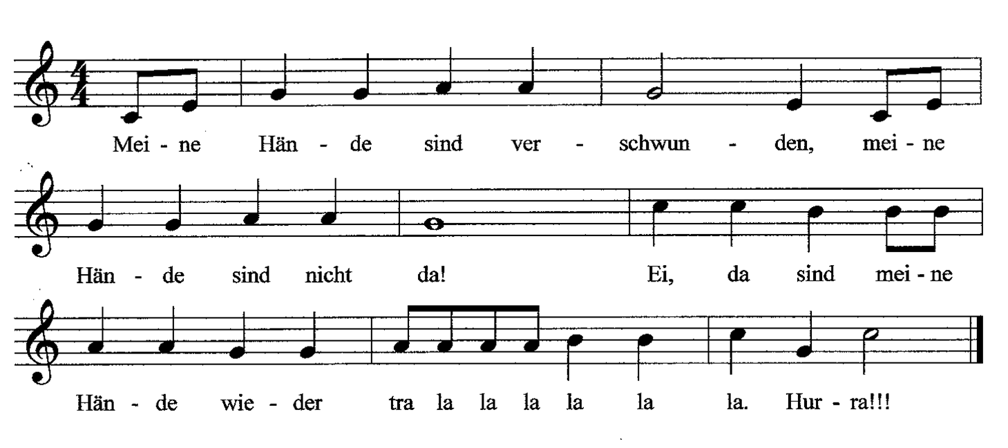 Hier verschwinden nicht nur deine Hände — auch Augen, Nase, Ohren usw. gehen in diesem Lied verloren. In jeder Strophe versteckst du ein anderes Körperteil.