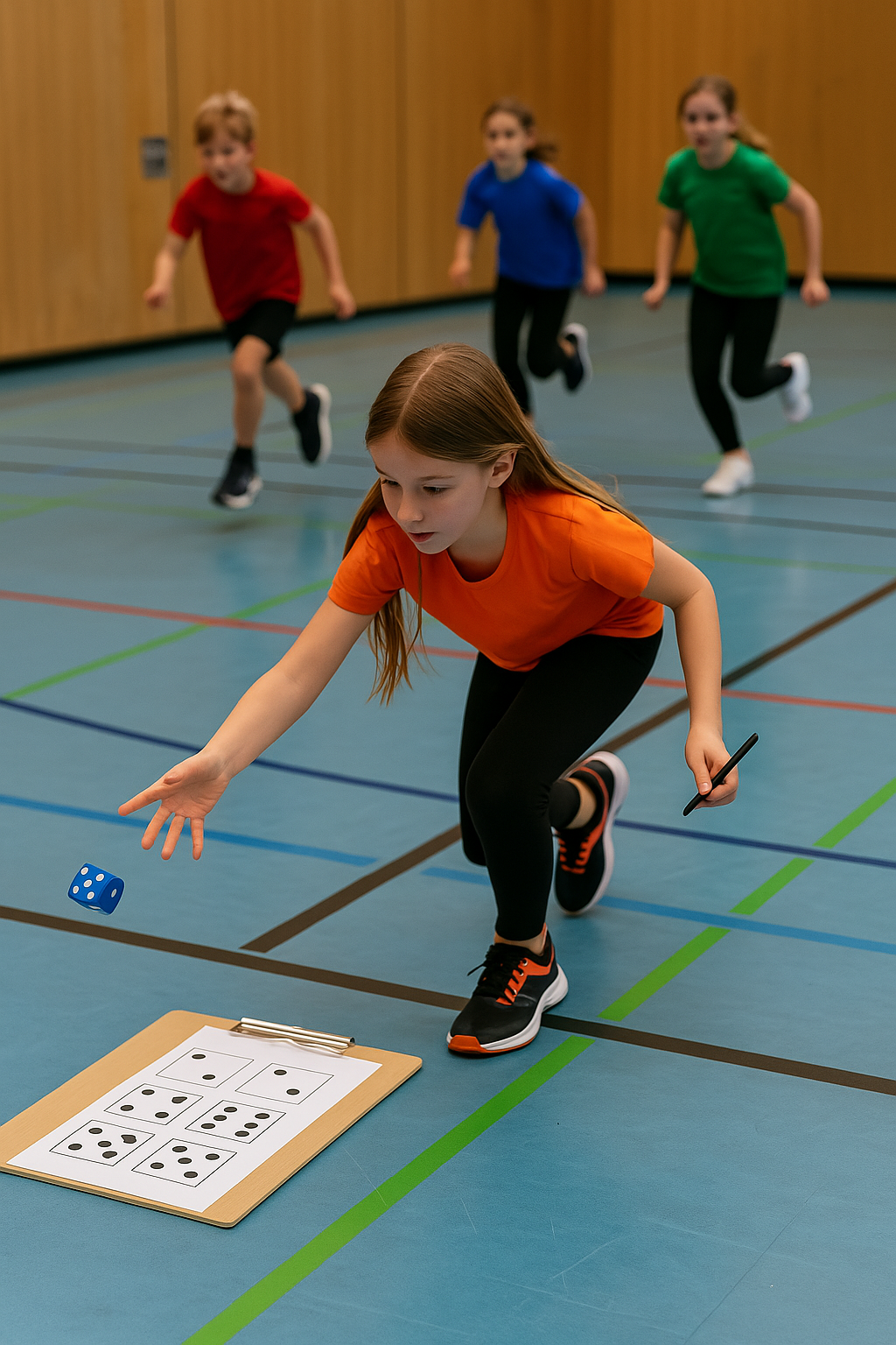 die Schüler bilden gleichgroße Gruppen und stellen sich an einer Seite der Halle auf. Auf der gegenüberliegenden Seite liegen für die Kinder bereit: Blatt mit den 6 Würfelbildern, Stift, Würfel